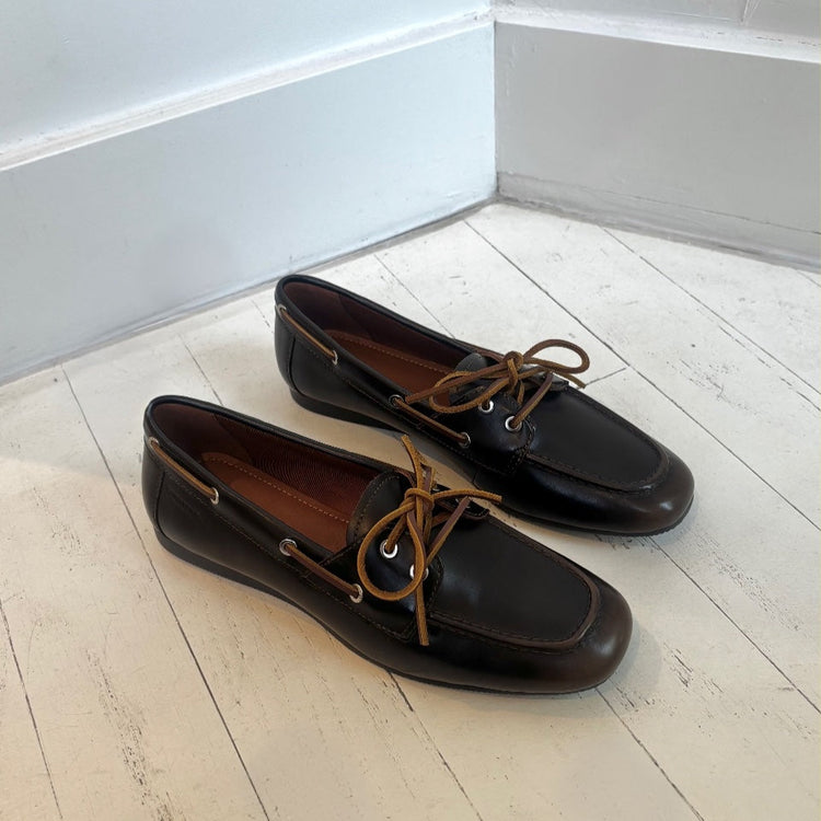Hillary reimagines traditional boat shoes with a contemporary edge. Crafted in brown suede, the heritage design features brass-toned eyelets, leather laces, and leather insoles. The slim 10 mm outsoles complete the look.
