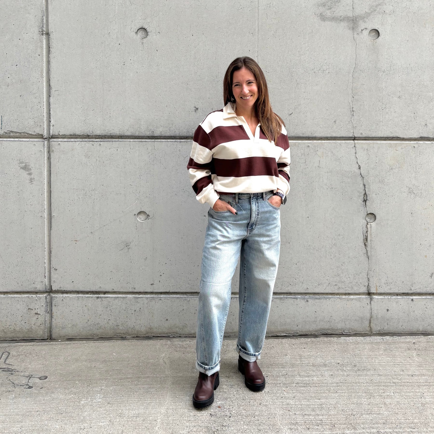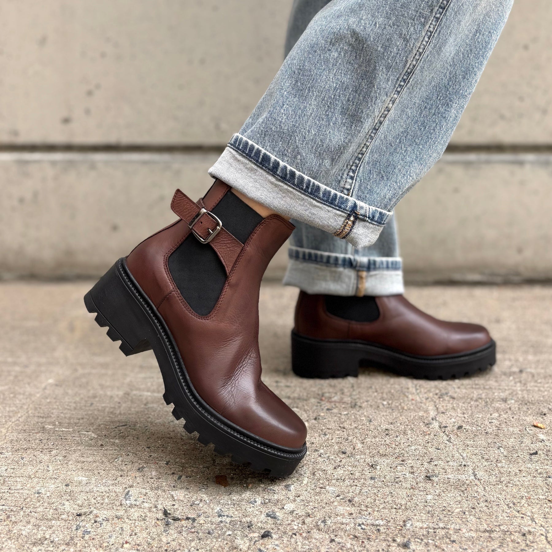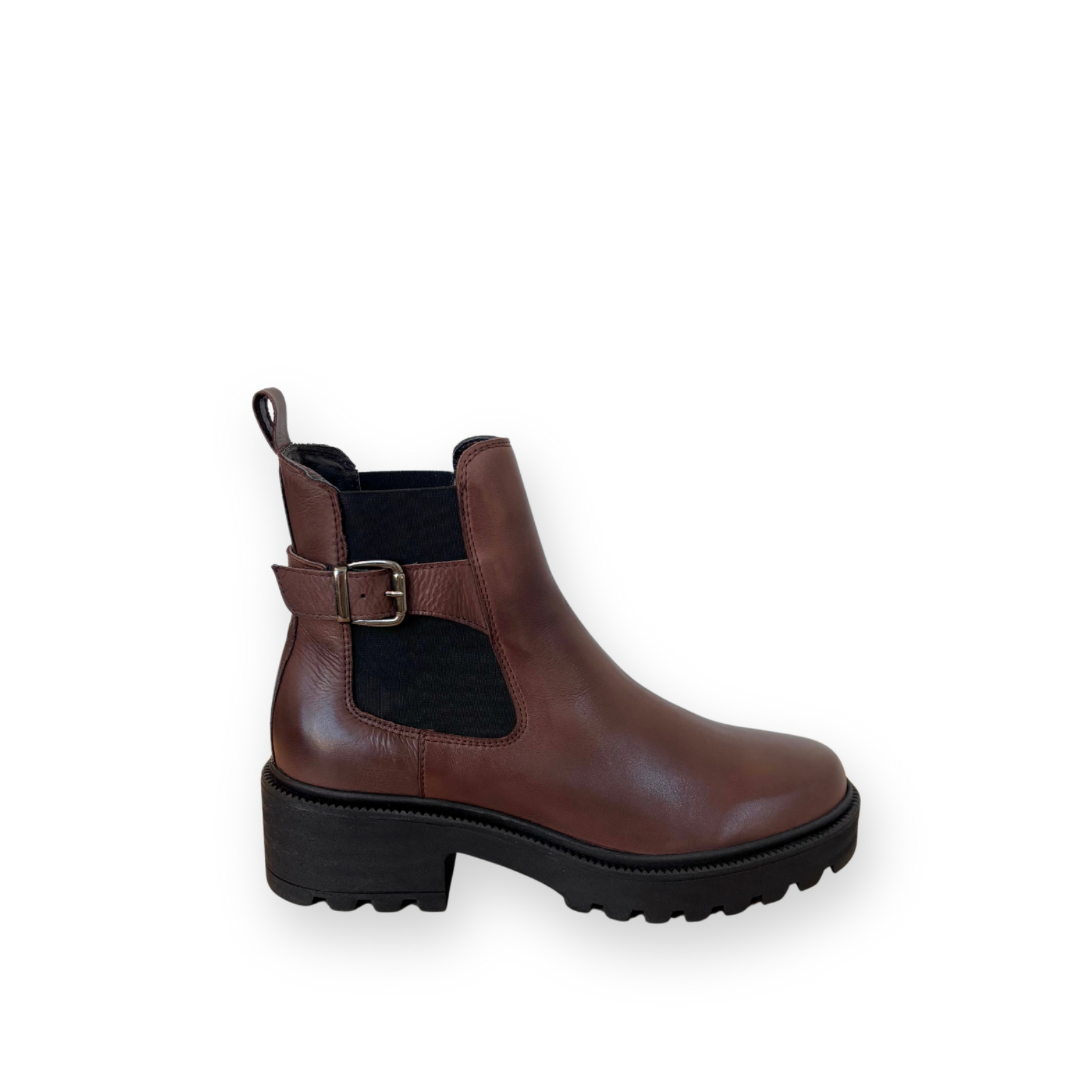 Pull on black leather ankle boot on a chunky lugged rubber sole with double elastic goring and an outer buckled strap.