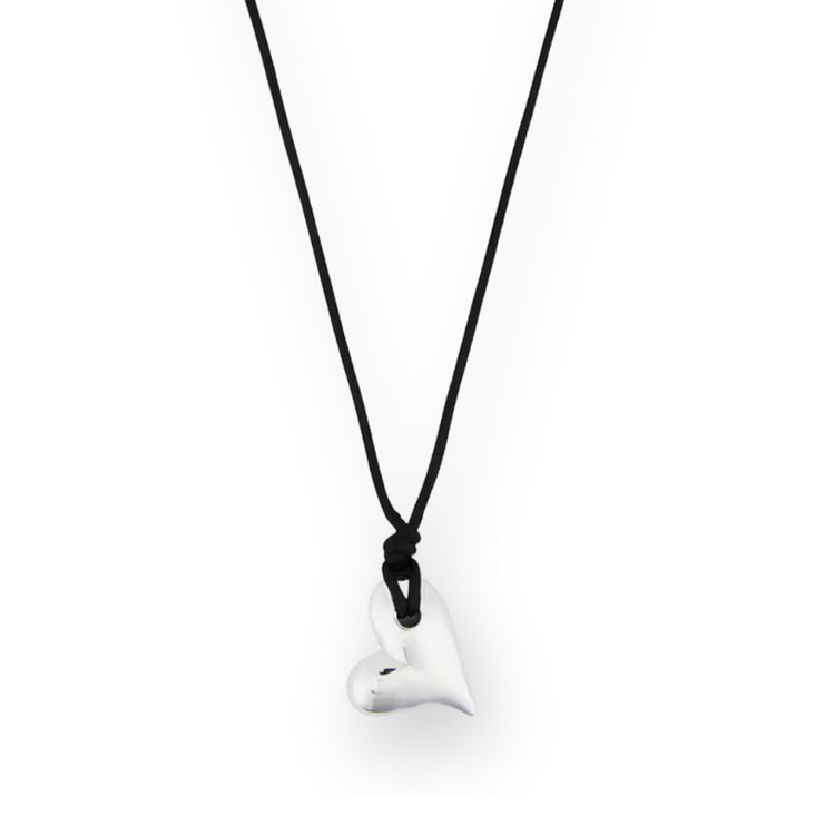 This voluminous silver heart pendant hangs from an adjustable beige cord made of recycled polyester. Finished in high-polish silver. To readjust the length of the cord, simply re-tie the knot closure.
