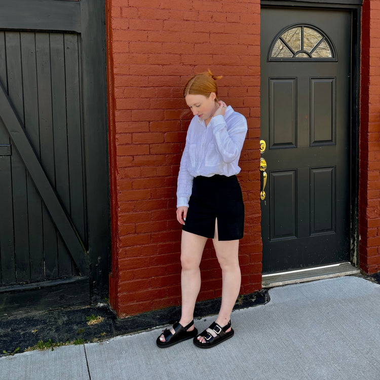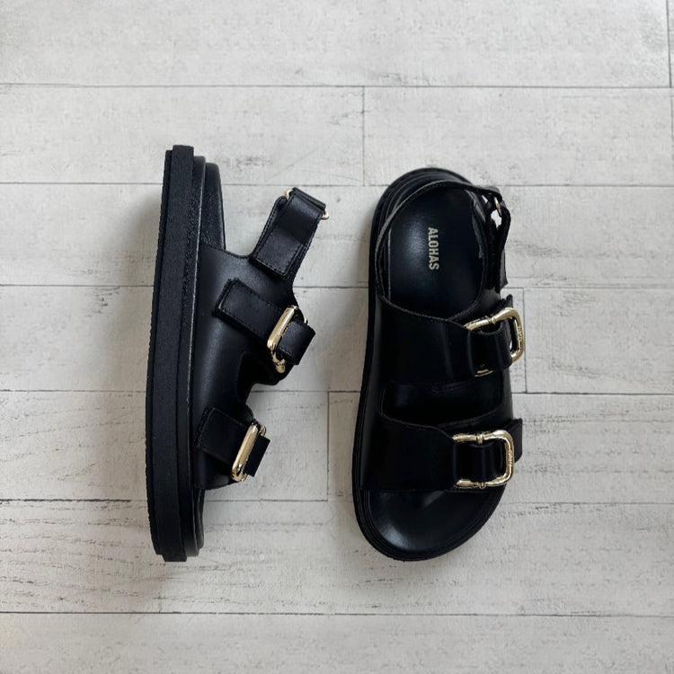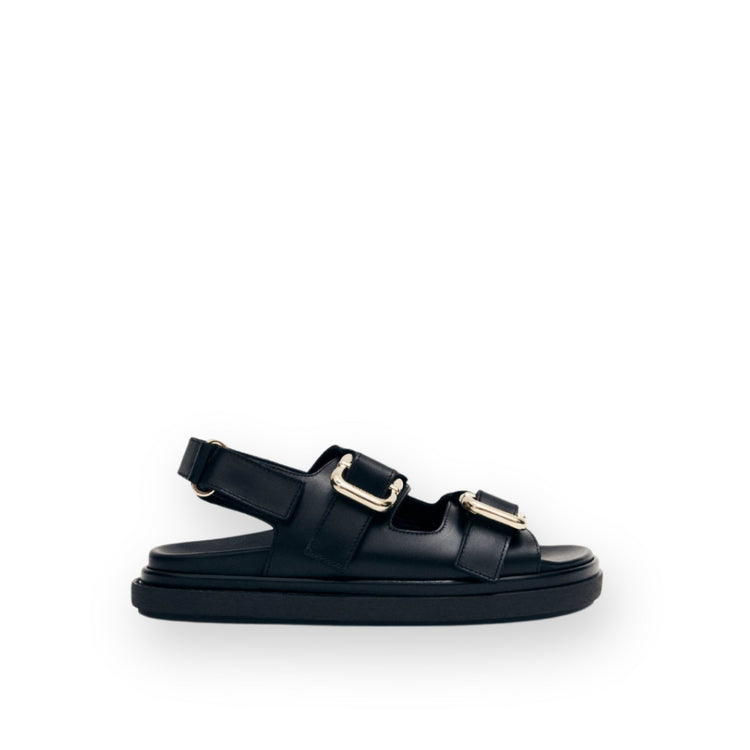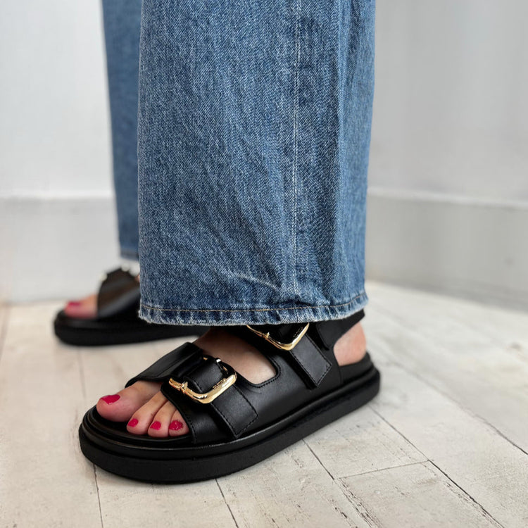 Buckle up! These black leather slingback sandals will take your summer style to new fashion destinations. The Harper has molded footbeds and raised rubber soles. The slingback silhouette ensures a comfortable fit, while the gold-tone, statement-making hardware crown the thick straps for a refined finish