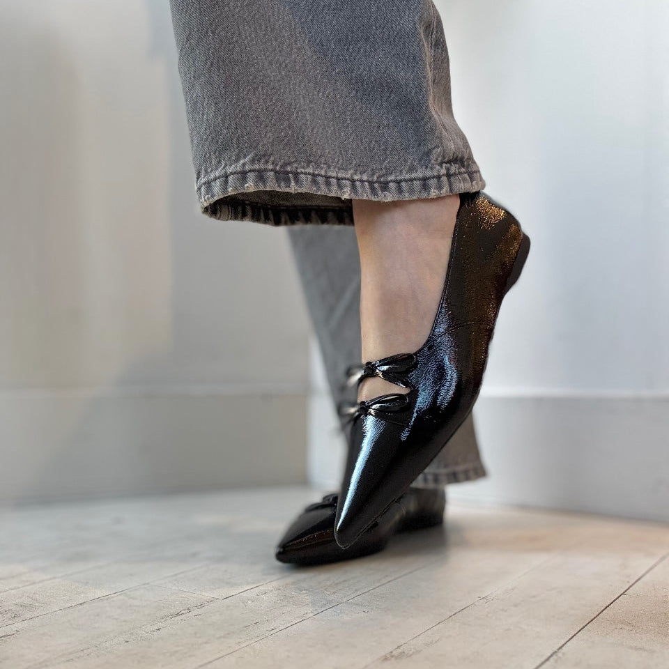 Hermine is a pair of sleek ballerinas crafted from black patent leather, which delivers a glossy finish. The design is highlighted by pointed toes and a decorative bow, adding a sophisticated touch. With leather lining and insoles, the flats are both elegant and versatile. The heels measure 10 mm.